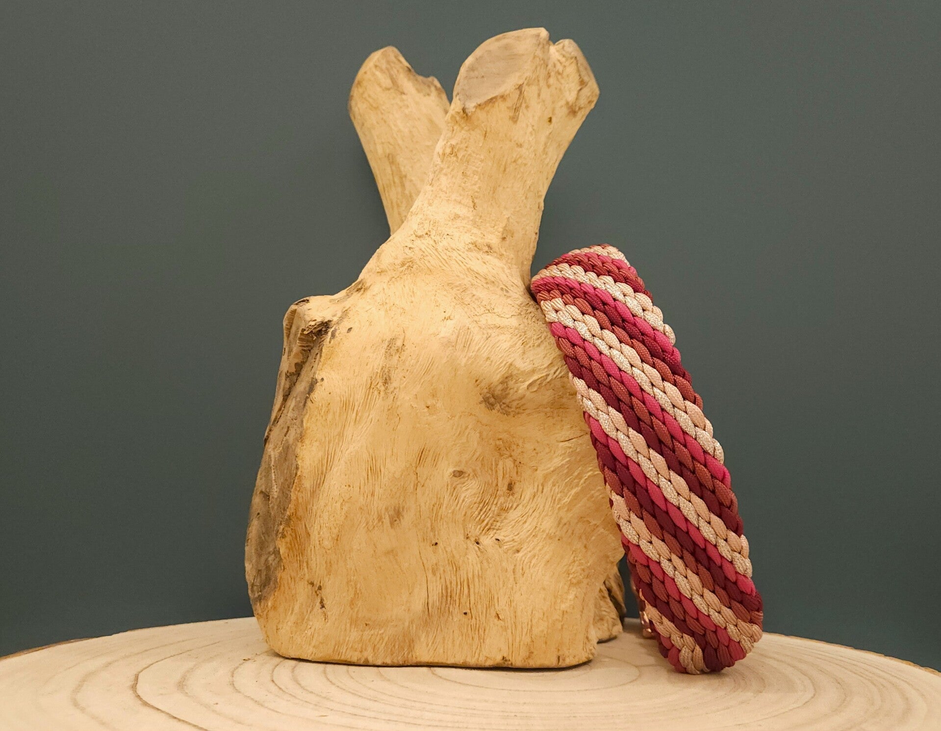 De halsband 'Luna' bestaat uit maar liefst 5 verschillende kleuren waarvan 1 glitterkoord en heeft een wijnrode verstelbare adapter met rosé gouden afwerking. De halsband is ongeveer 4 cm breed en 1,5 cm dik. Hij is daardoor in het bijzonder geschikt voor de grotere hondenrassen.