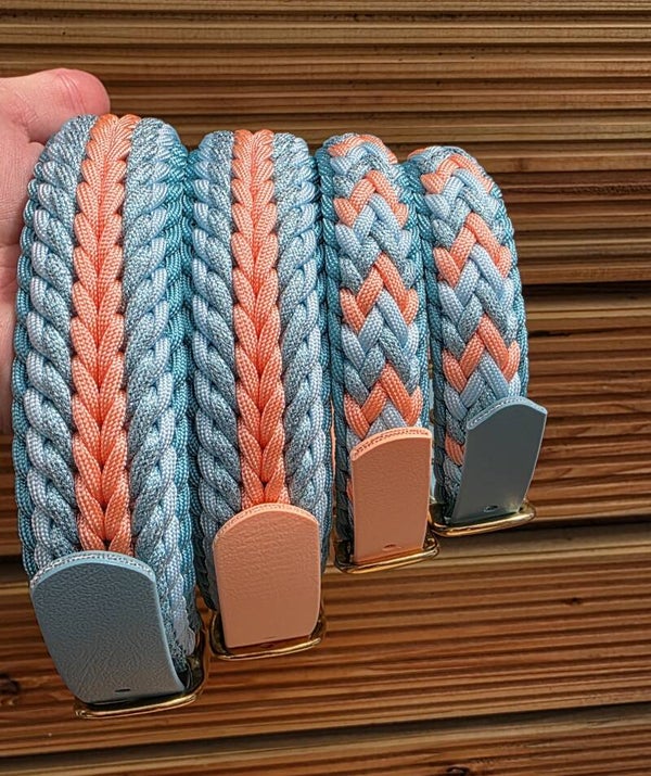 Wil je graag een bijpassende riem? Klik dan hier om een riem samen te stellen en voer de volgende kleuren in: Turquoise, Pastel Blauw (2x) en Blood Oranje + zilveren of gouden afwerking