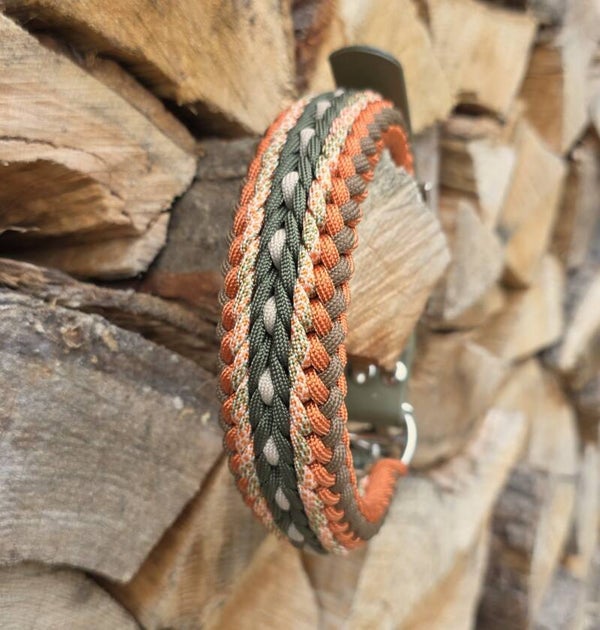 De halsband uit de serie 'Foggy Autumn' bestaat uit 5 verschillende kleuren en heeft een olijfkleurige verstelbare adapter met zilveren afwerking. De halsband is ongeveer 3,5 cm breed.