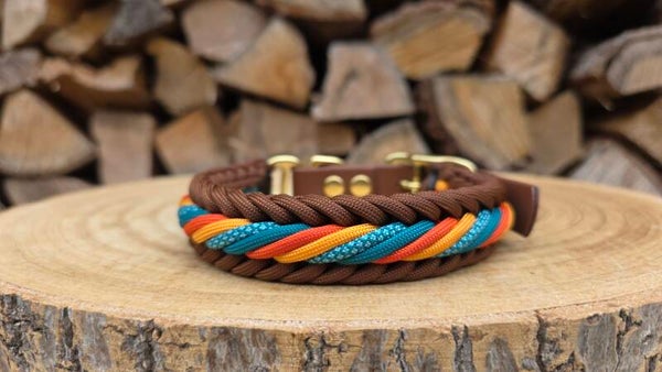 De halsband 'Autumn Breeze' bestaat uit 5 verschillende kleuren en heeft een middenbruine verstelbare adapter met gouden afwerking. De halsband is ongeveer 2,5 cm breed en is daardoor zeer geschikt voor de kleinere tot middelgrote hondenrassen.