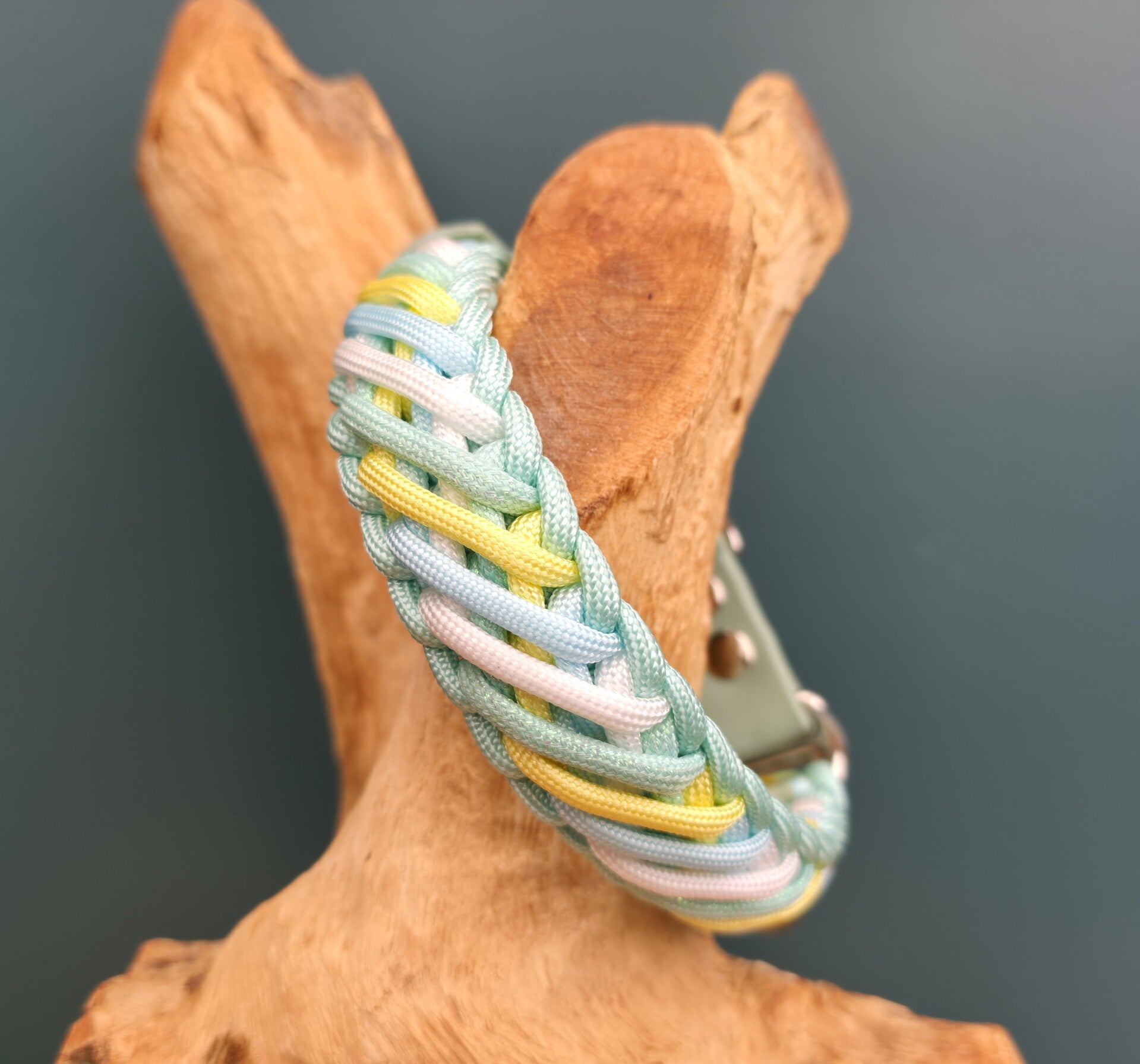De halsband 'Daisy Meadow' bestaat uit 5 verschillende kleuren waaronder één glitterkoord. De halsband is afgewerkt met een sage groene verstelbare adapter met zilveren hardware.