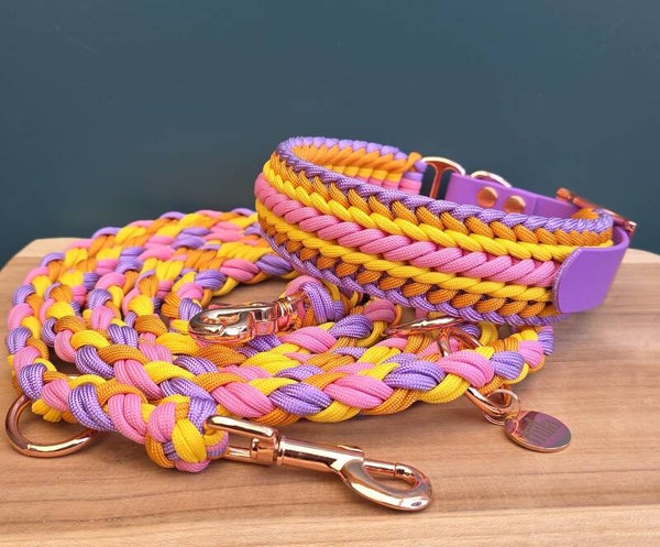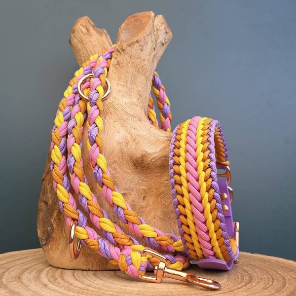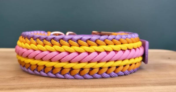De halsband 'Flower Pop' bestaat uit 4 verschillende kleuren en heeft een amethyst kleurige verstelbare adapter met rosé gouden hardware. De halsband is ongeveer 4 cm breed en dus bijzonder geschikt voor de middelgrote tot grote hondenrassen.