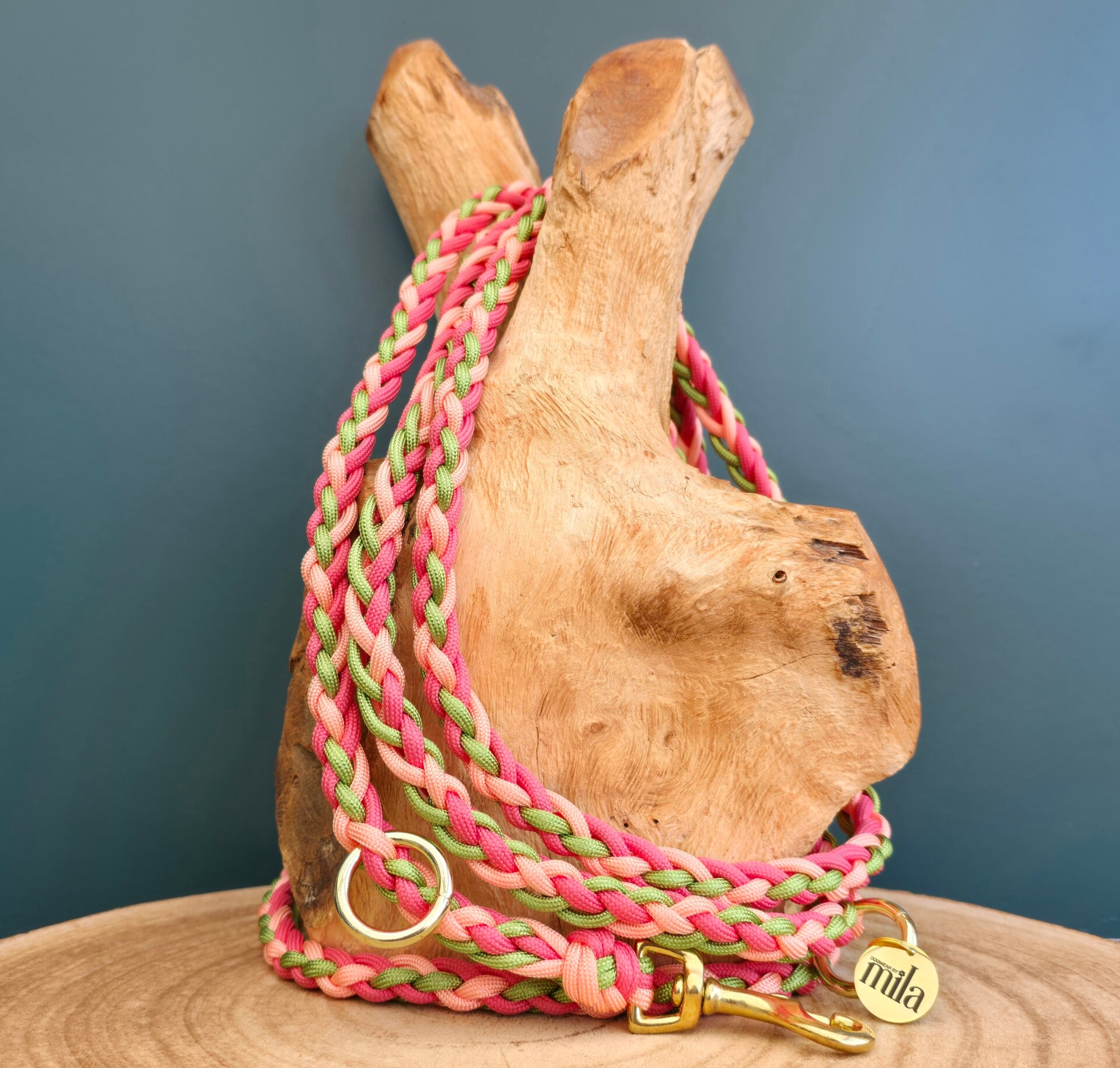 De riem uit de serie 'Watermelon Fizz - mini' bestaat uit 3 verschillende kleuren en is afgewerkt met een gouden musketon. De riem is in meerdere lengtes verkrijgbaar waaronder verstelbare varianten.
